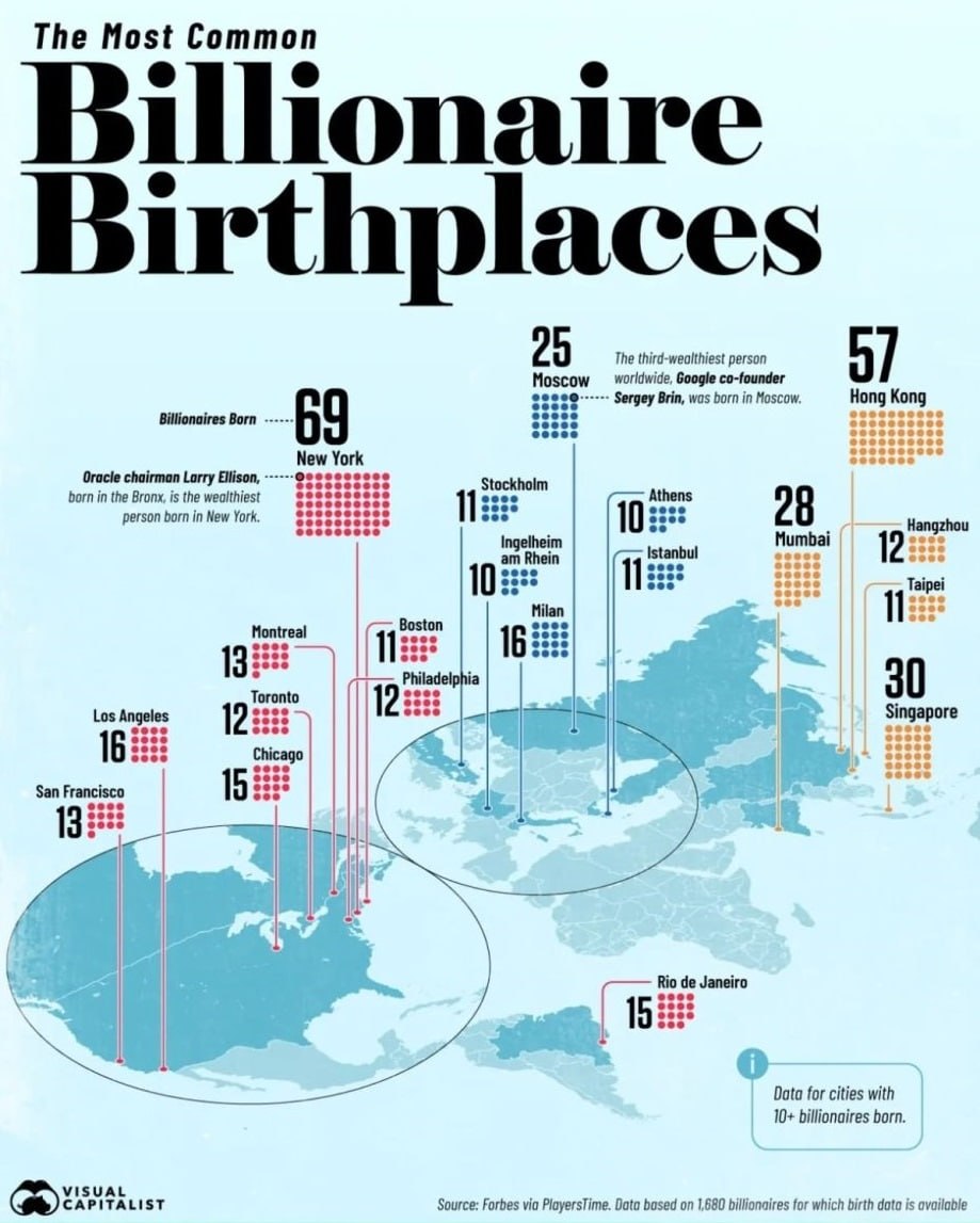 Nyu-York Yer üzündə ən çox milyarderin yaşadığı şəhər kimi tanınsa da, onun qlobal uğur mərkəzi kimi reputasiyası artıq doğum mərhələsindən formalaşır. Təhlil edilən milyarderlər arasında 69 nəfər Nyu-Yorkda doğulub - bu göstərici dünyada hər hansı digər şəhərdən daha yüksəkdir və hətta ABŞ-nin növbəti beş şəhərinin ümumi göstəricisini də üstələyir.