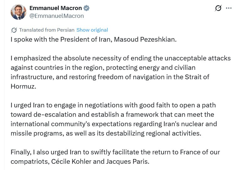 Fransa Prezidenti Emmanuel Makron İran Prezidenti Məsud Pezeşkian ilə telefon danışığı aparıb.