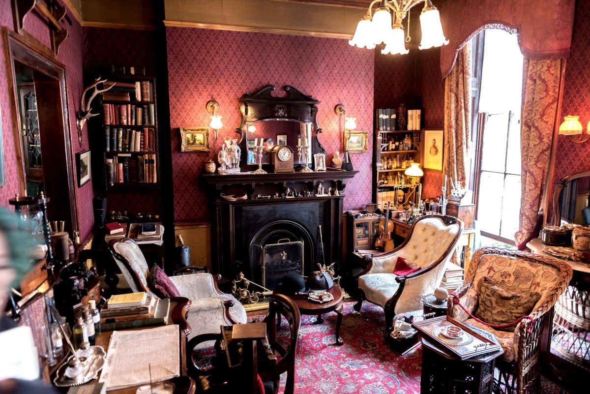 Binanın üç mərtəbəsində əsərə uyğun olaraq təchiz olunmuş qonaq otağı və yataq otaqları var: skripka, kimya laboratoriyası, Vatsonun revolveri, boru və kamin...