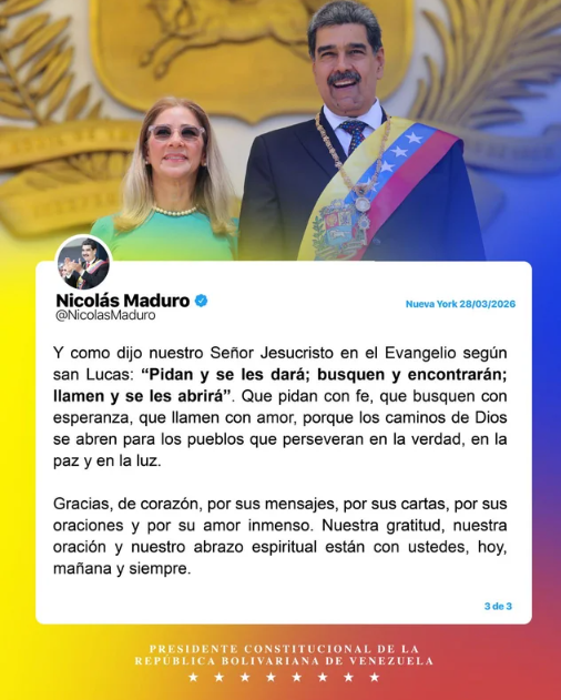 Maduro Venesuela vətəndaşlarından və bütün dünyadakı xoşməramlı insanlardan məktublar və dualar aldığını söyləyib.
