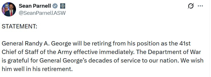 Bildirilib ki, general Rendi Corc Ordunun 41-ci Baş Qərargah rəisi vəzifəsindən dərhal sonra təqaüdə çıxır. Hərbi Nazirlik onun ölkəyə xidmətini yüksək qiymətləndirərək təşəkkür edib və təqaüddə uğurlar arzulayıb.