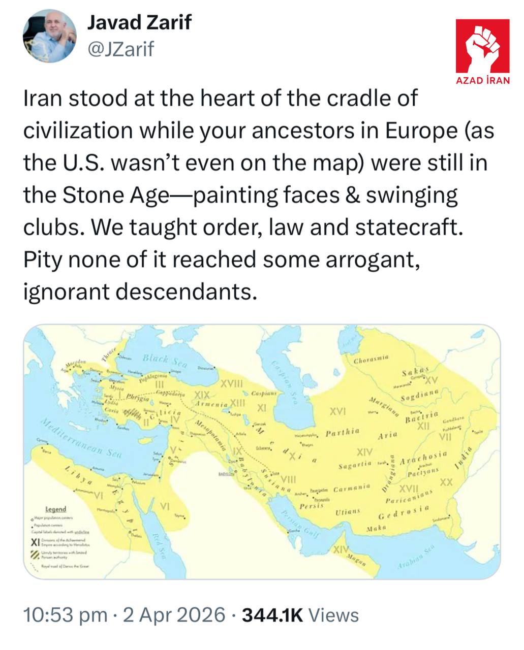 “İran sivilizasiyanın beşiyinin mərkəzində dayananda, Avropadakı əcdadlarınız (ABŞ xəritədə belə yox idi) hələ Daş dövründə idilər — şəkillər çəkir və dəyənəklərlə oynayırdılar. Biz qayda-qanunu, nizamı və dövlətçiliyi öyrədirdik. Təəssüf ki, bunların heç biri bəzi təkəbbürlü və cahil nəsillərə çatmadı”.