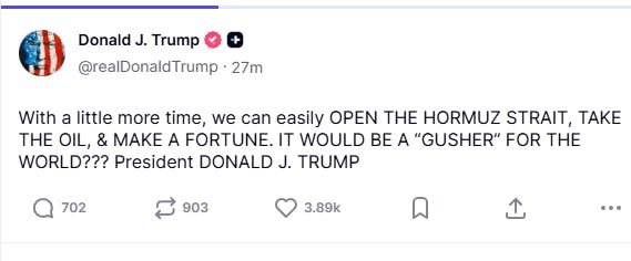 "Bir az əlavə vaxtla biz Hörmüz boğazını asanlıqla aça, nefti götürə və sərvət qazana bilərik. Bu, bütün dünya üçün əsl "qızıl mədəni" olacaq???", - o yazıb.