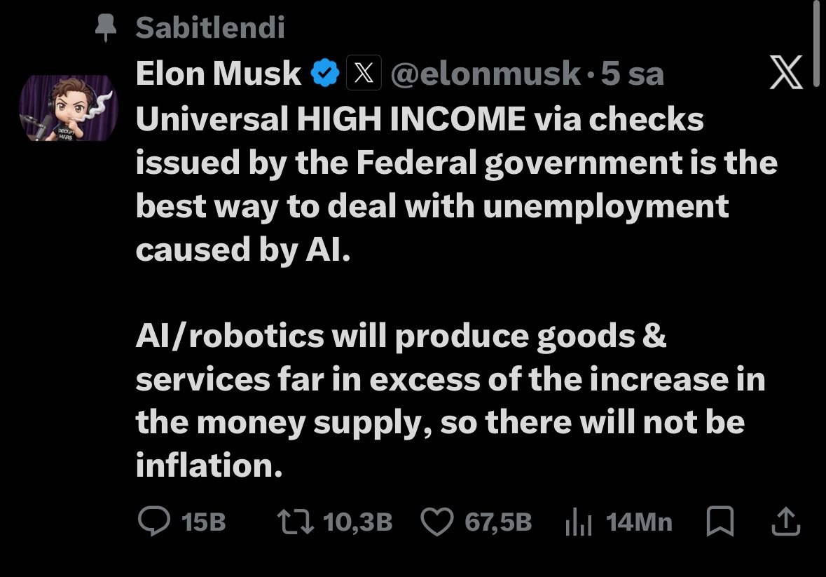 Onun sözlərinə görə, süni intellekt insanı əmək bazarından sıxışdırdığı üçün ölkədə işsizlik səviyyəsi artır. Maskın fikrincə, federal hökumətin vətəndaşlara pul paylaması yüksək gəliri təmin etməyə imkan verə bilər.