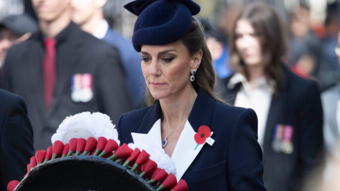 Keyt Middlton tünd mavi palto-don, şlyapa və sapfir zinət əşyaları ilə ictimaiyyət qarşısına çıxaraq II Elizabetin stilini yenidən canlandırıb.