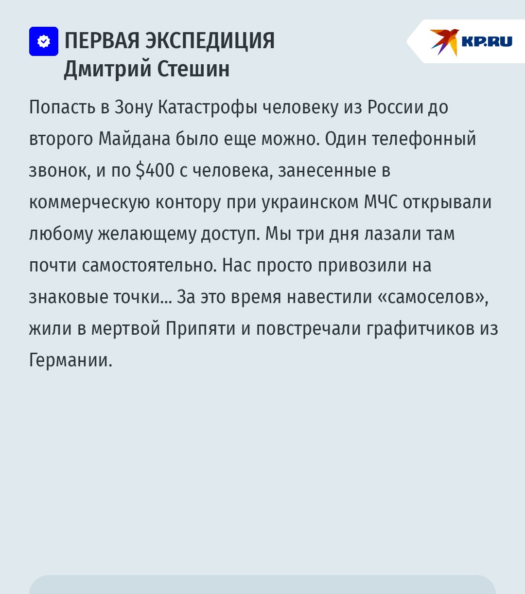 Məlumata görə, jurnalistlər Aleksandr Kots və Dmitri Steşin Çernobıl Təcrid Zonasına iki dəfə səfər ediblər. Onlardan biri faciədən 20 il sonra, “stalker” adlandırılan bələdçilərin ekstremal turistlər üçün gizli ekskursiyalar təşkil etdiyi dövrə təsadüf edib.
