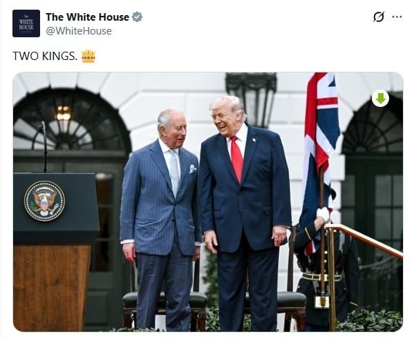 Fotoda Tramp və Kral III Çarlz Ağ Evdə keçirilən rəsmi qarşılanma mərasimi zamanı yan-yana dayanmış vəziyyətdə görünürlər. Şəklin üzərində isə “Two Kings” — “İki kral” sözləri yazılıb.