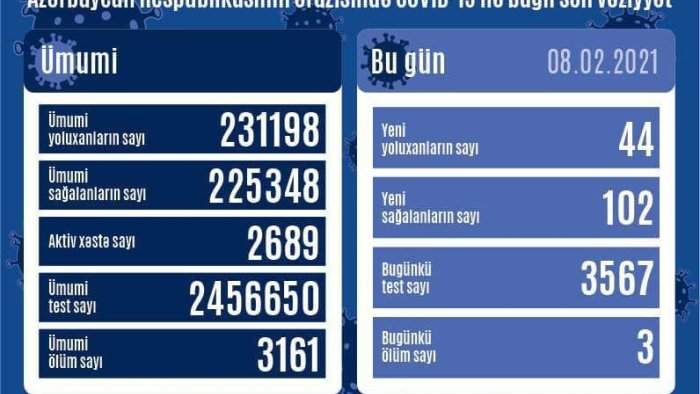 Son sutka ərzində yeni yoluxma hallarının müəyyənləşdirilməsi ilə əlaqədar 3 567, bu günə qədər isə ümumilikdə 2 45 66 50 test icra olunub