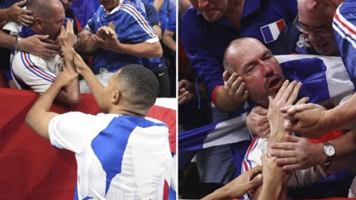 Bundan sonra fanat bir müddət huşsuz vəziyyətdə qalıb. Mbappe üzr istəmək üçün azarkeşə yaxınlaşıb.