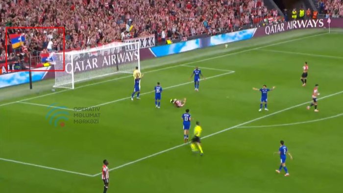 Bizim.Media xəbər verir ki, azarkeşlər arasında bir qrup təxribatçı tribunada ləğv edilmiş qondarma rejimin “bayrağı”nı nümayiş etdiriblər.