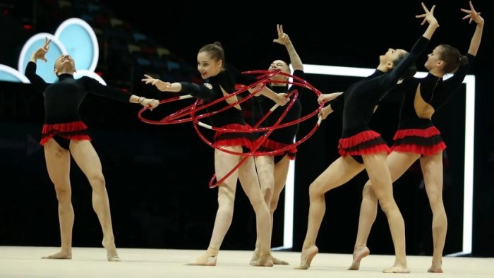 Bizim.Media xəbər verir ki, tərkibi Güllü Ağalarzadə, Ləman Əlimuradova, Kamilla Əliyeva, Zeynəb Hümmətova, Yelizaveta Luzan və Darya Sorokinadan ibarət komanda 5 halqa ilə hərəkətlərdə 32.850 xal toplayıb və fəxri kürsünün ən yüksək pilləsinə qalxıb.
