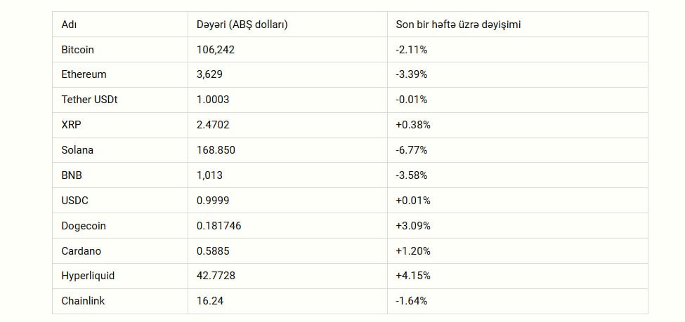 Kriptovalyuta bazarında son qiymətlər məlum olub.