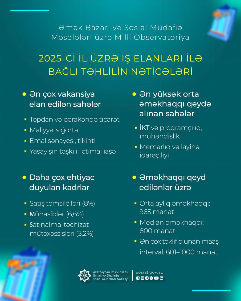 Əmək və Əhalinin Sosial Müdafiəsi Nazirliyinin tabeliyindəki Əmək Bazarı və Sosial Müdafiə Məsələləri üzrə Milli Observatoriya tərəfindən 2025-ci il üzrə iş elanlarının təhlili aparılıb. Təhlilin nəticələrinə əsasən ölkənin əmək bazarındakı əsas tendensiyalar və tələbat istiqamətləri müəyyən edilib.