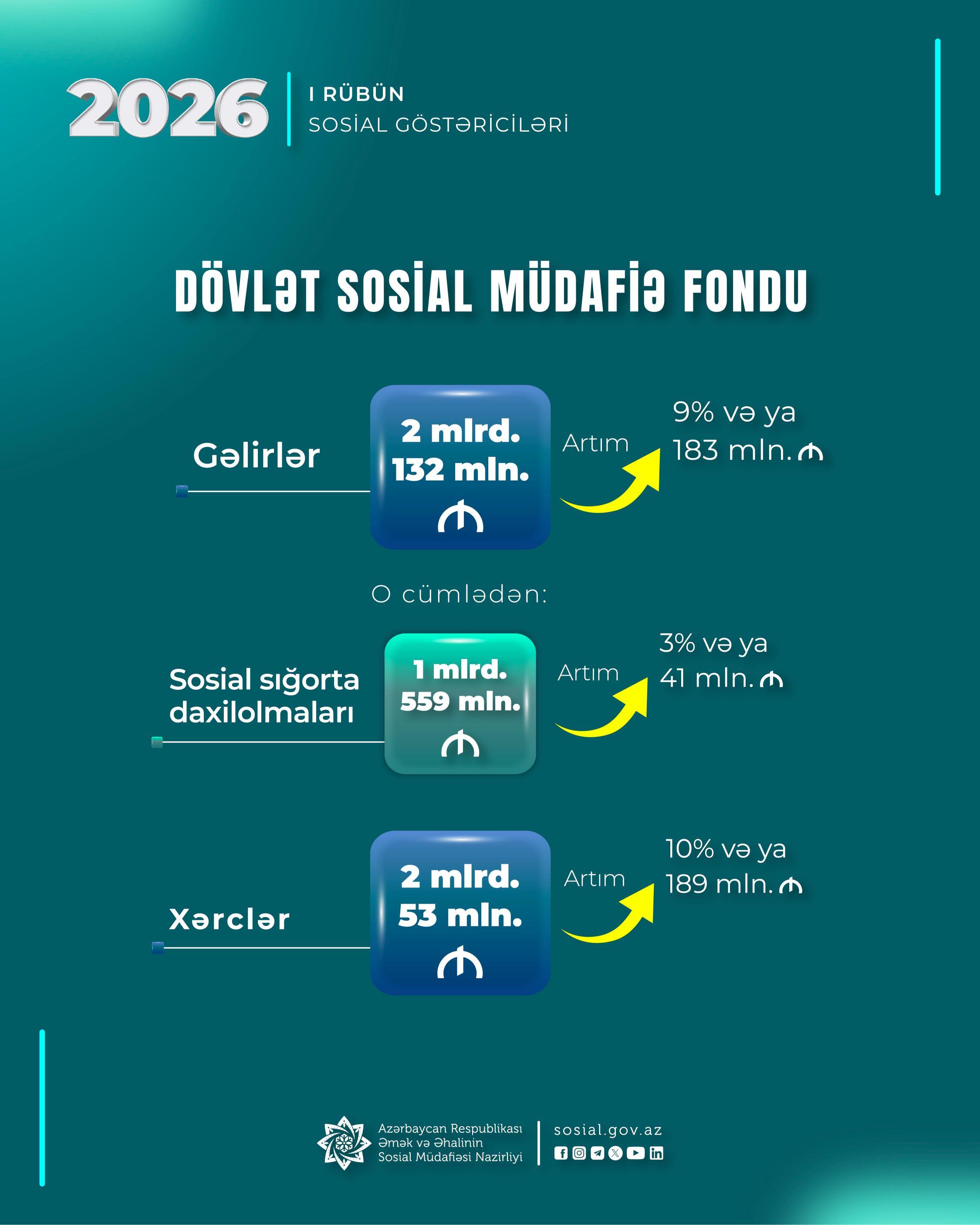 Əmək və Əhalinin Sosial Müdafiəsi Nazirliyinin (ƏƏSMN) tabeliyində Dövlət Sosial Müdafiə Fondunun (DSMF) gəlirləri bu ilin I rübündə proqnozla müqayisədə 9 faiz və ya 183 mln. manat çox olmaqla 2 mlrd. 132 mln. manat təşkil edib.
