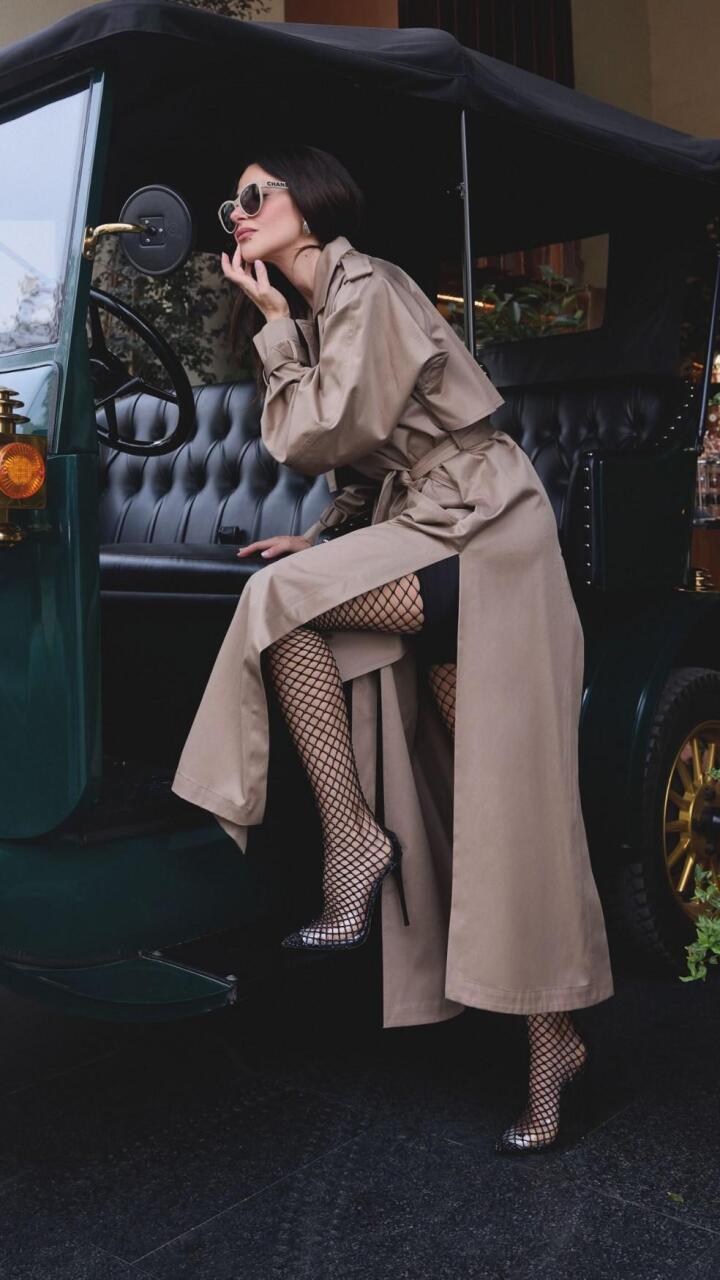 Nəsrin uzun plaşdan istifadə etsə də önünü açaraq qara corablarını nümayiş etdirib.