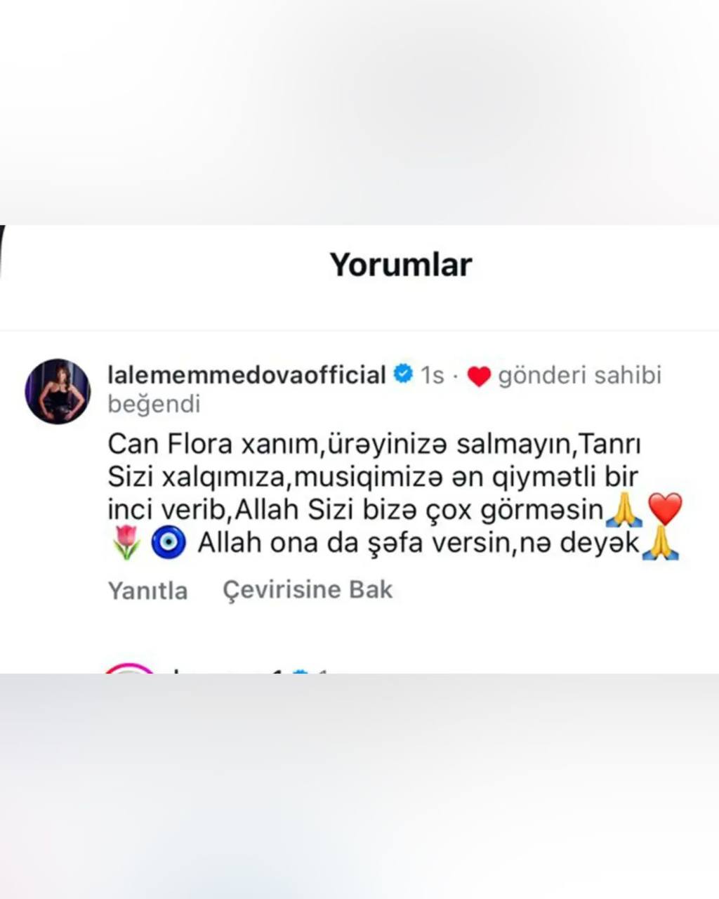 “Can Flora xanım, ürəyinizə salmayın, Tanrı sizi xalqımıza, musiqimizə ən qiymətli bir inci verib, Allah sizi bizə çox görməsin. Allah ona da şəfa versin, nə deyək”, - deyə, Məmmədova qeyd edib.