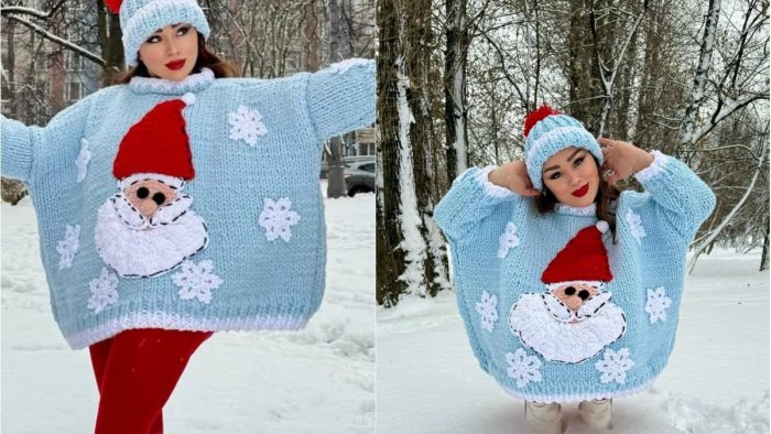 Xatirə fotosessiyasında qırmızı və mavi rəngli qalın qış geyimlərindən istifadə edib.