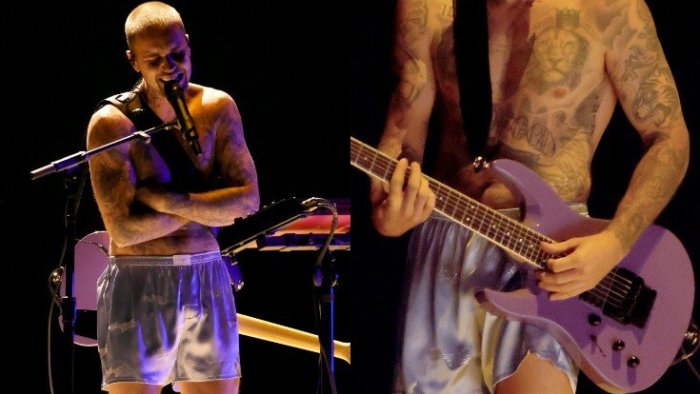 Bizim.Media xəbər verir ki, ifaçı tədbirdə şortiklə səhnəyə çıxaraq bədənindəki bütün döymələri nümayiş etdirib.