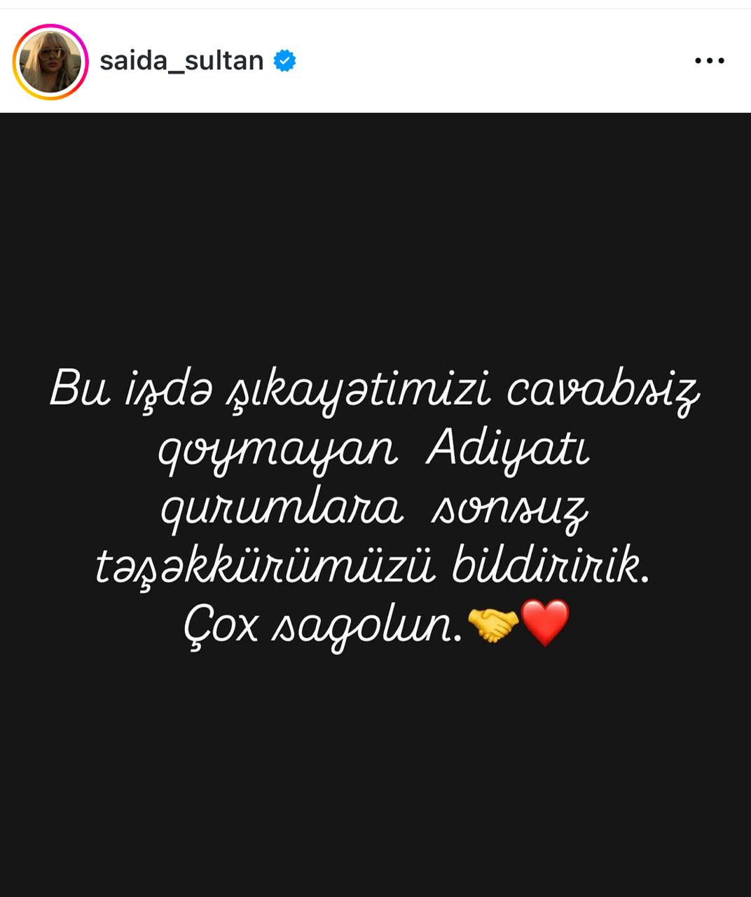 "Bu işdə şikayətimizi cavabsız qoymayan aidiyyatı qurumlara sonsuz təşəkkürümüzü bildiririk, çox sağ olun", - deyə Səidə Sultan paylaşımda qeyd edib.