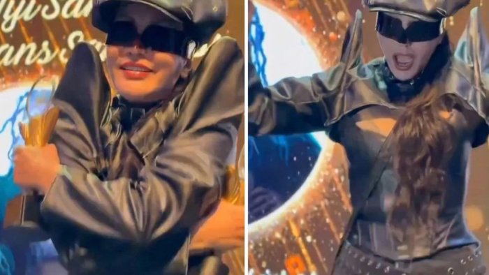 Bizim.Media xəbər verir ki, qeyri-adi geyimi ilə gecəyə damğa vuran müğənni mükafatını almaq üçün səhnəyə çıxaraq tamaşaçıları salamlayıb.