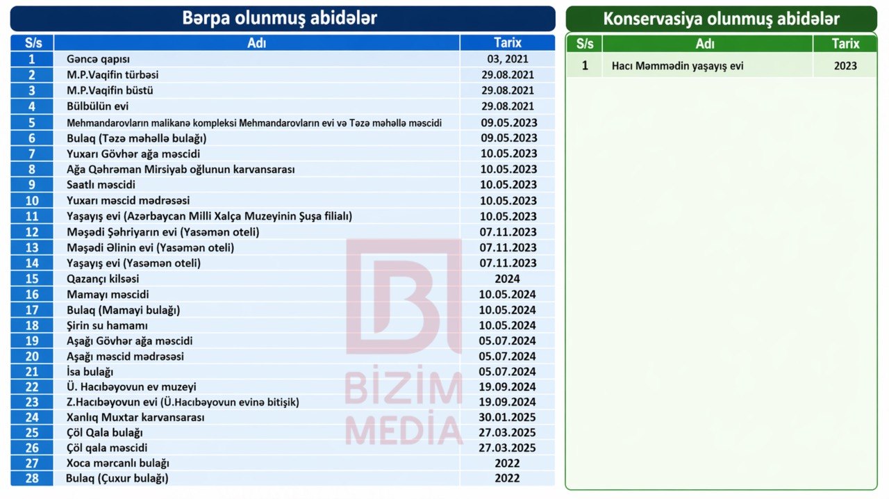 Şuşa Qoruq İdarəsindən Bizim.Media-nın sorğusuna cavab olaraq bildirilib ki, Şuşa şəhərində tarixi abidələrin bərpası üzrə görülmüş işlər nəticəsində 28 abidə bərpa edilib, 1 abidə isə konservasiya olunub.