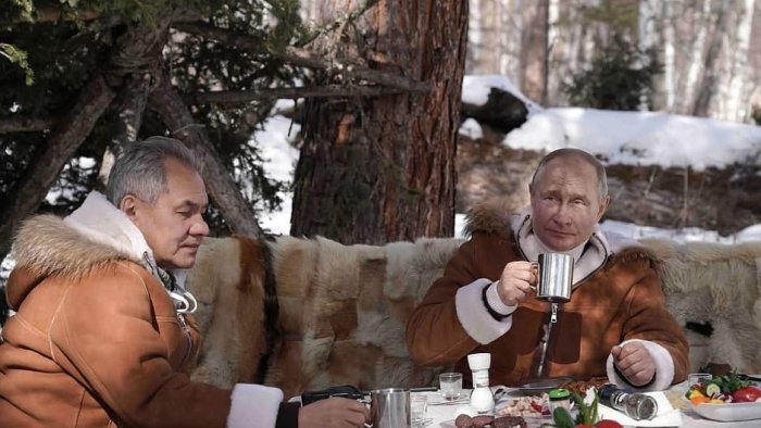 “Putin və Şoyqu Sibir Federal Dairəsində istirahət edirlər. Onlar meşədə piayada gəzir və ağacların sirlərini öyrənirlər. Müdafiə naziri həmçinin dövlət başçısına quru ağacdan maraqlı fiqurlar düzəltməyin qaydaları haqda danışıb, özünün Tayqada yerləşən emalatxanasını göstərib”.