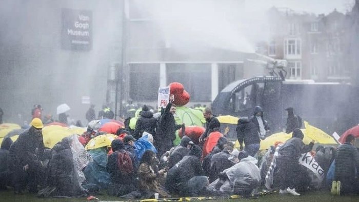 Amsterdamda polislər su şırnağı ilə etirazı dağıtmağa çalışdı - VİDEO