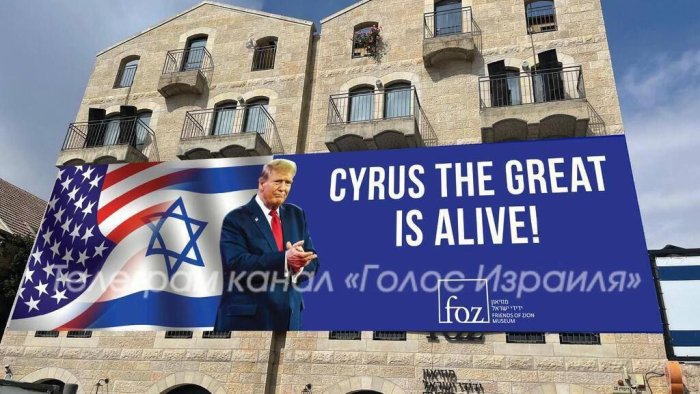 Yerusalimdə ABŞ prezidenti Donald Trampın portreti və “Böyük Kir sağdır!” şüarı yazılmış bilbordlar, ABŞ və İsrail bayraqları ilə yanaşı yerləşdirilib.