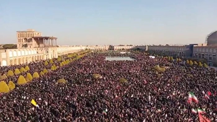 Bizim.Media xəbər verir ki, İranın Press TV telekanalının yayımladığı görüntülərdə böyük insan kütləsinin Nəqşi-Cahan meydanında toplandığı görünür.