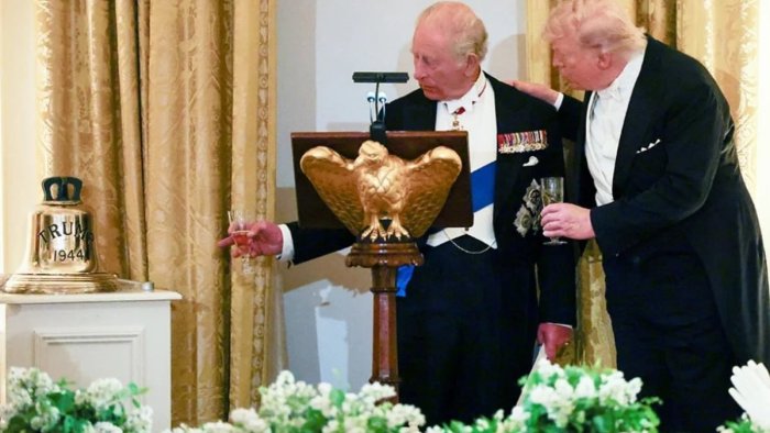 Çıxışının sonunda III Çarlz Trampa utilizasiya edilmiş Britaniya sualtı qayığı “HMS Trump”dan götürülən gəmi zəngini hədiyyə edib.