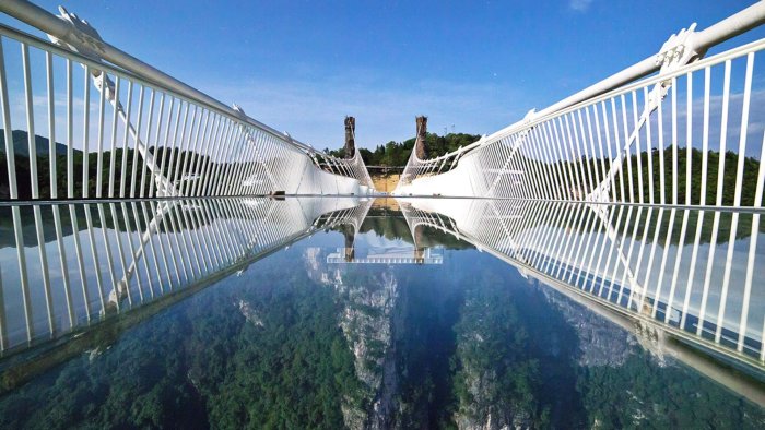 Çində bir nəfər təmir olunan şüşə körpü ilə gedən zaman çuxura düşüb.