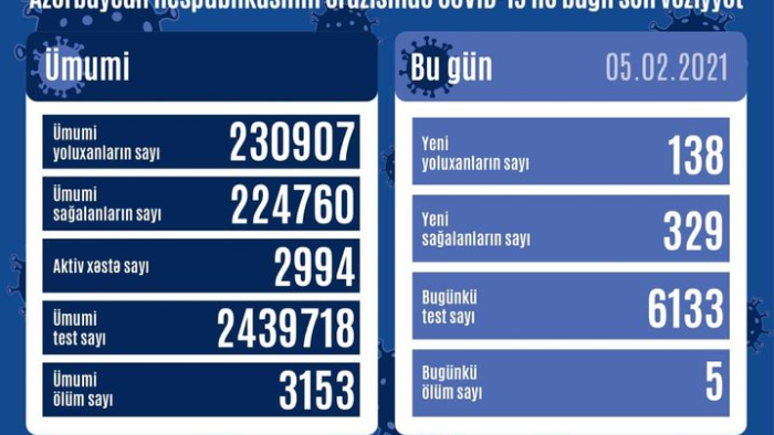 Azərbaycan Respublikasında koronavirus (COVID-19) infeksiyasına 138 yeni yoluxma faktı qeydə alınıb, 329 nəfər müalicə olunaraq sağalıb.