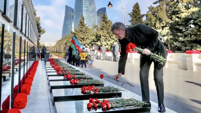 “Twitter”də dərc olunan paylaşımına diplomat ötən il Şəhidlər xiyabanını ziyarətindən görüntüsünü də əlavə edib.