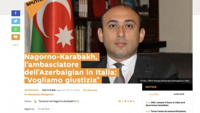 Bizim.Media xəbər verir ki, müsahibələr “Azərbaycanın İtaliyadakı səfiri: "Biz ədalət istəyirik” və “İtaliya Ermənistanı dayandırmaq üçün fəal olmalıdır” başlıqları ilə dərc olunub.