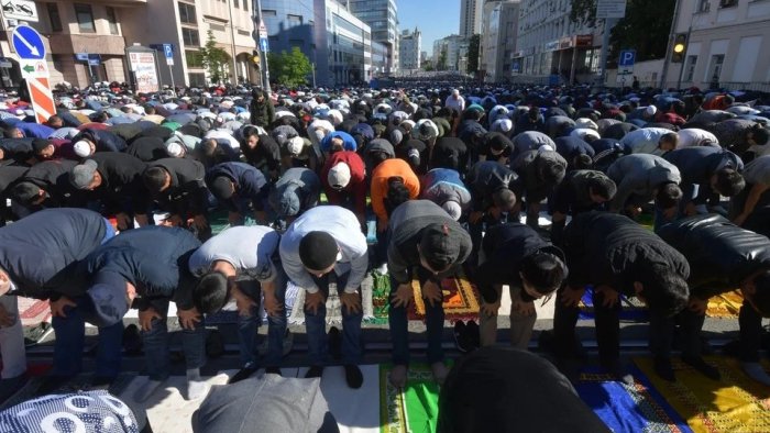 Moskvada 100 mindən çox müsəlman bayram namazı qılmaq üçün Cümə məscidinə toplaşıb .