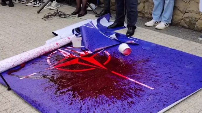 Moldova parlamentinin üzvü Aleksandr Nesterovski mitinq zamanı kartonda çap olunmuş NATO bayrağını cırıb və üzərinə “qan” rəmzi olaraq qırmızı boya töküb.