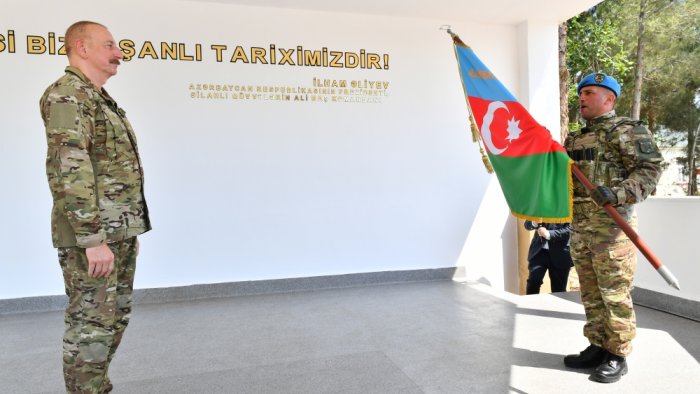 Ali Baş Komandan İlham Əliyev Döyüş bayrağını hərbi hissənin komandirinə təqdim edib.