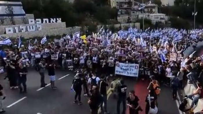 Oktyabrın 7-də HƏMAS yaraqlıları tərəfindən Qəzza zolağında əsir götürülən girovların qohumları hökumətin hərəkətlərinə etiraz etmək üçün Təl-Əvivdən Qüdsə doğru yürüş edirlər.