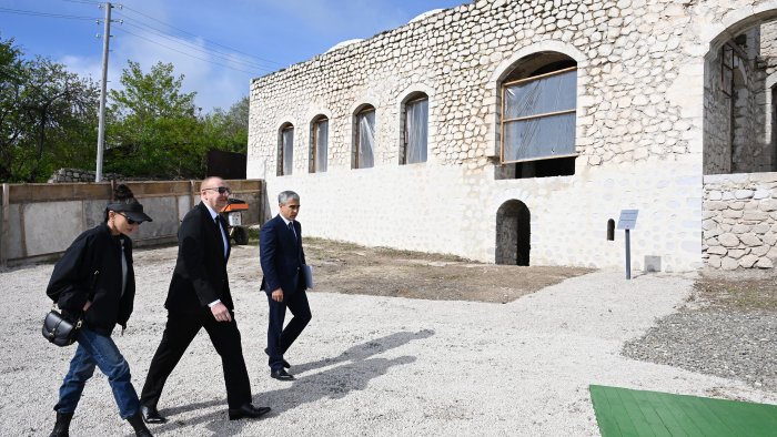 Azərbaycan Respublikasının Prezidenti İlham Əliyev və Birinci xanım Mehriban Əliyeva Şuşada Çöl Qala məscidində aparılan bərpa işləri ilə tanış olublar.