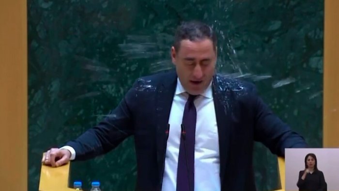 Gürcüstan parlamentində müxalif deputat Giorgi Vaşadzenin çıxışı zamanı üzərinə su töküblər.