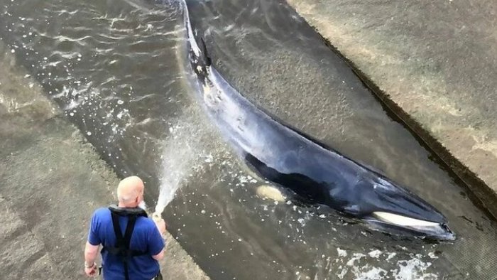 Xilasedicilərin gəlişindən əvvəl balinanın çıxa bilməsi üçün şlüzü su ilə doldurublar.