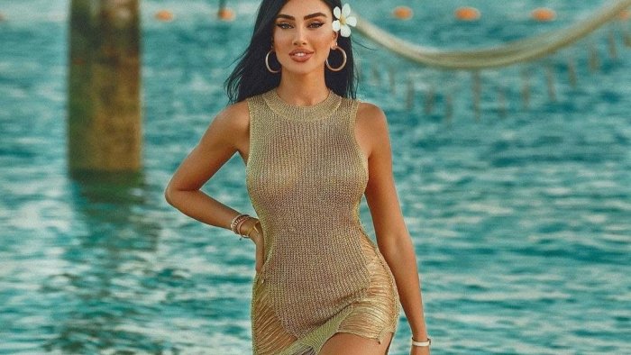 Gözəl bədən quruluşu ilə seçilən Diana bəyaz velosipedin yanında elə ağ rəngdə dar libasla dayanıb.