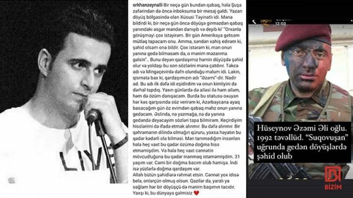 Amerikada yaşayan azərbaycanlı reper, keçmiş HOST qrupunun üzvü Orxan Zeynallı şəhidlə bağlı təsirli paylaşımı ilə diqqət çəkib.