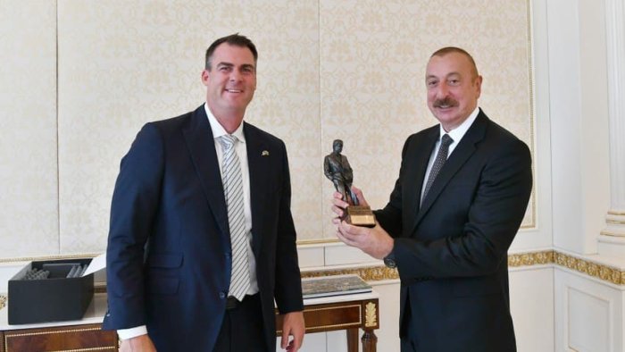 Oklahoma ştatının qubernatoru görüş zamanı prezident İlham Əliyevə "kovboy" papağı da hədiyyə edib.