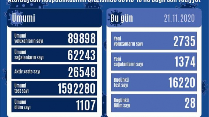 Azərbaycan Respublikasında koronavirus (COVID-19) infeksiyasına 2735 yeni yoluxma faktı qeydə alınıb, 1374 nəfər müalicə olunaraq sağalıb və evə buraxılıb.