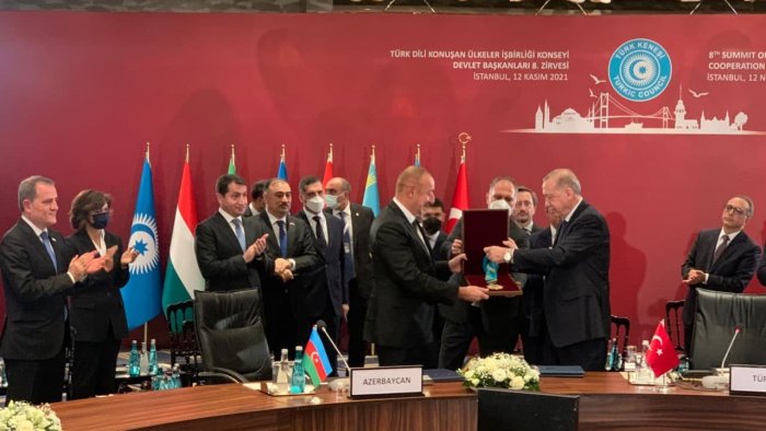 Bizim.Media xəbər verir ki, orden Azərbaycan liderinə Türkdilli Dövlətlərin Əməkdaşlıq Şurasının İstanbulda keçirilən VIII Zirvə görüşündə Türkiyə prezidenti Rəcəb Tayyib Ərdoğan tərəfindən təqdim edilib.