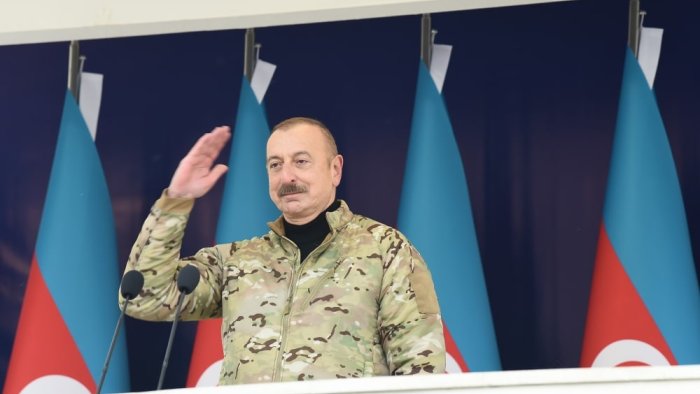 Çıxışı Prezident İlham Əliyev və birinci xanım Mehriban Əliyeva, oğulları Heydər Əliyev izləyiblər.
