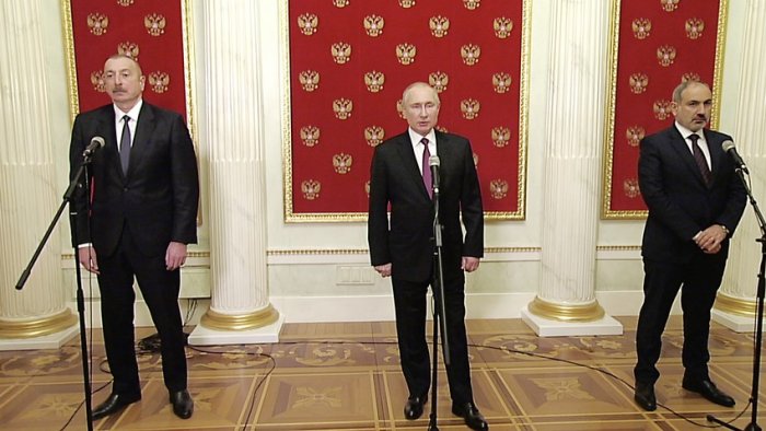 Bizim.Media xəbər verir ki, Rusiyanın Paytaxtı Moskva şəhərində Azərbaycan Prezidenti İlham Əliyev, rusiyalı həmkarı Vladimir Putin və Ermənistan Baş naziri Nikol Paşinyanın iştirakı ilə 4 bəndən ibarət olan yeni sənəd imzalandı.