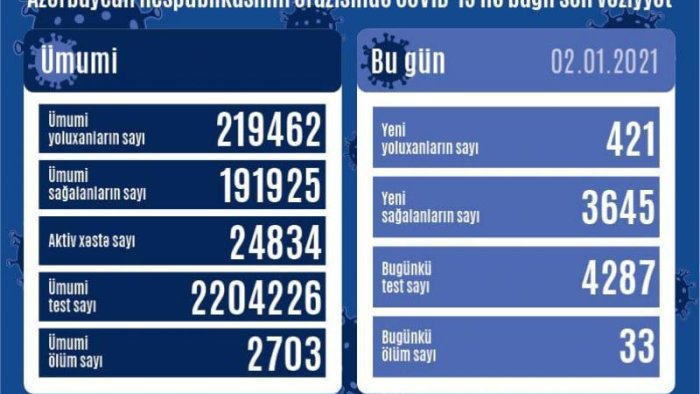 Məlumata görə, son sutkada 33 nəfər COVID-19-dan vəfat edib.