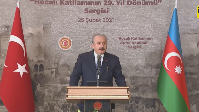Türkiyə parlamentinin sədri Mustafa Şəntop Xocalı qətliamının 29-cu ildönümündə TBMM-də təşkil olunan sərginin açılışında çıxış edib.
